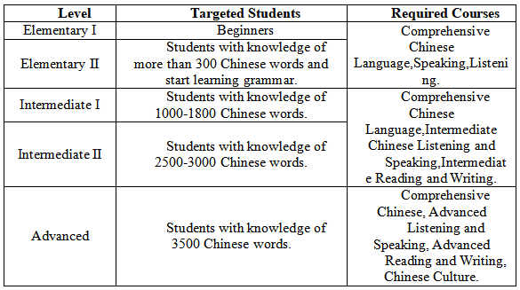 There are mainly5different levels of classes for Chinese language programs.Elementary I, Elementary Ⅱ, Intermediate I, IntermediateⅡ, and Advanced.Languagecourses are compulsory and culture courses are elective.