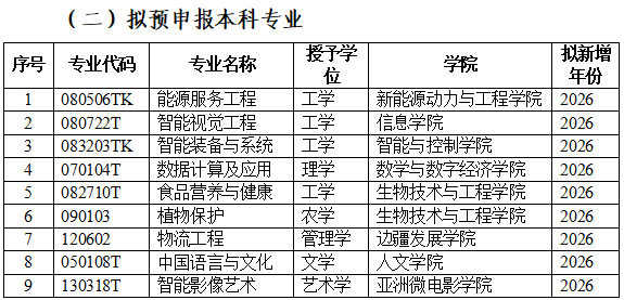 根据《教育部高等教育司关于开展2025年度普通高等学校本科专业设置工作的通知》(教高司函〔2025〕3号)和《云南省教育厅关于做好2025年度普通高等学校本科专业设置工作的通知》要求,经学校党委会、校长办公会会议审议通过,2025年学校拟新增设本科专业11个,预备案专业9个。现将拟新增设本科专业和预申报本科专业情况进行公示: