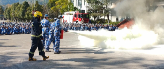 随着消防警报响起,新生们在军训教官指引下一手护头、一手用湿毛巾捂住口鼻,迅速沿预定路线有序撤离至安全区域;临沧市消防救援局的消防员演示高空救援,模拟解救被困人员,并现场讲授室内逃生要领与灭火器操作规范;在油盆灭火实操环节,师生代表轮番上阵,亲身体验初期火灾的扑救过程。