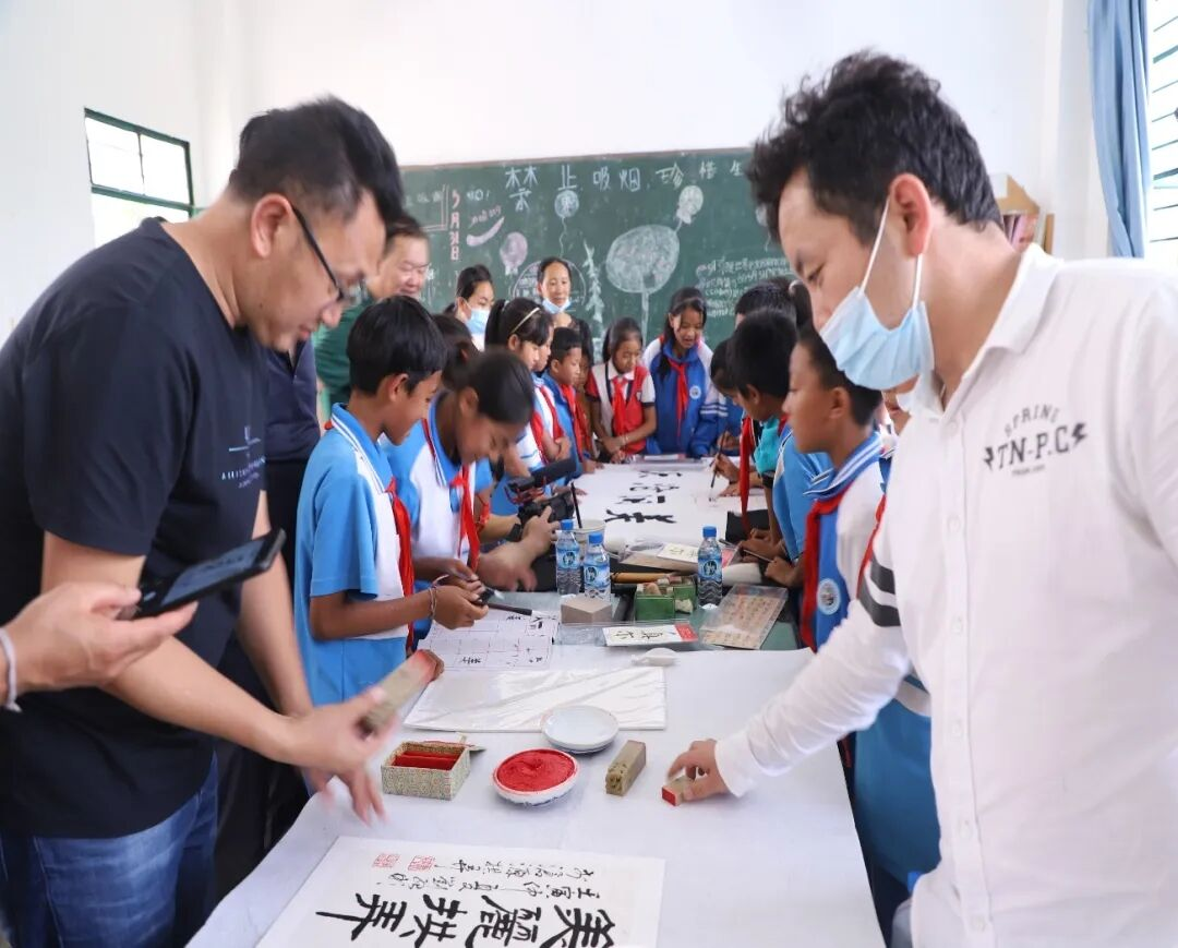 在拱弄村,我校师生在村委会、村小学张贴推广普通话相关宣传海报,在村小学讲授汉字书写示范课,在村小学现场进行书法创作,向村委会、村小学相关办公室赠送“请讲普通话”提示牌,向村小学赠送普通话教材、书法描红本、字帖、笔墨纸砚等教学用品,在村小学开展普通话能力水平问卷调研。活动取得了良好的效果,深受当地佤族群众及村小学师生好评。